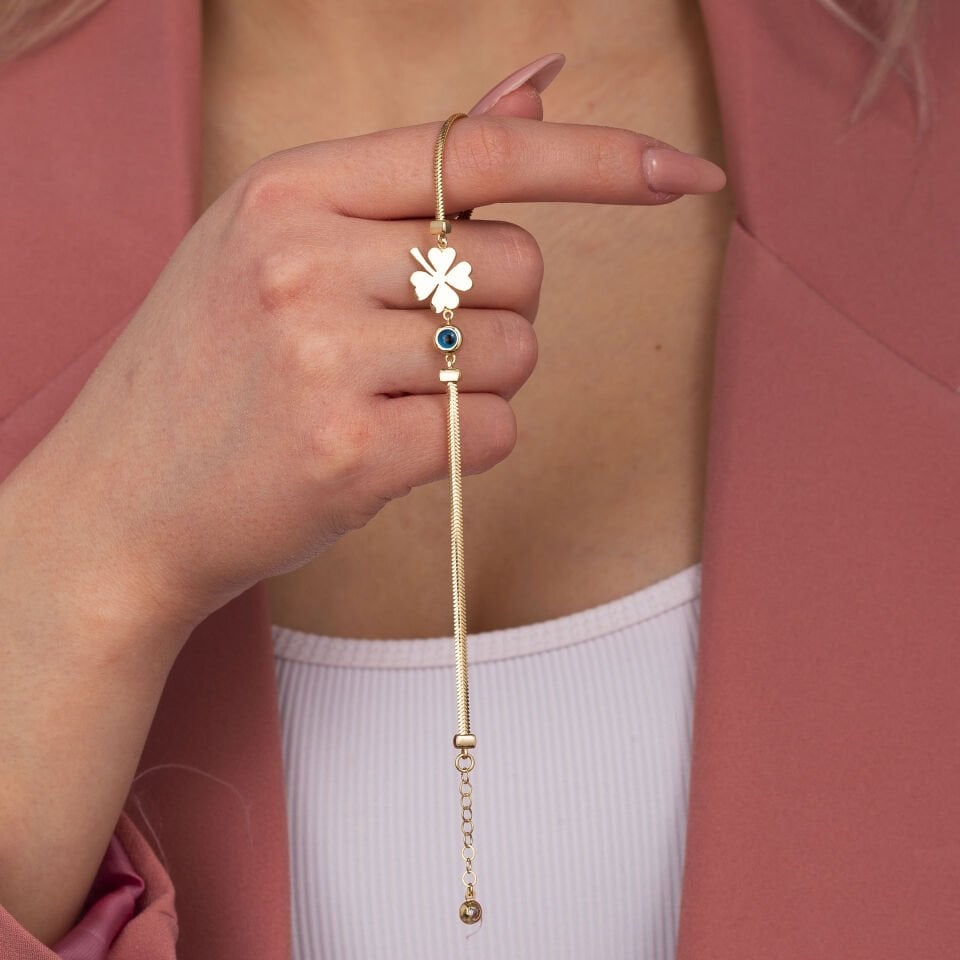 Göz Boncuk Detay Yonca Kalp Altın Bileklik