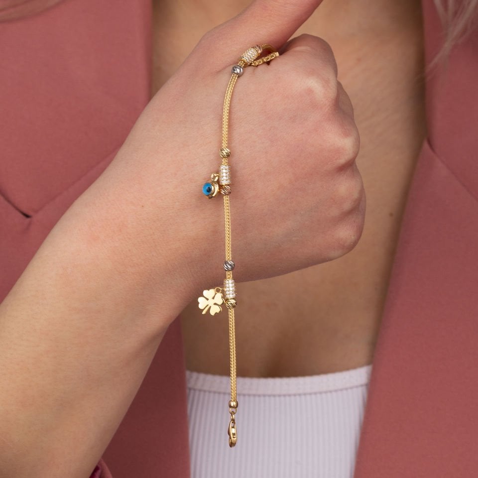 Göz Boncuklu Kalp Yonca Altın Bileklik